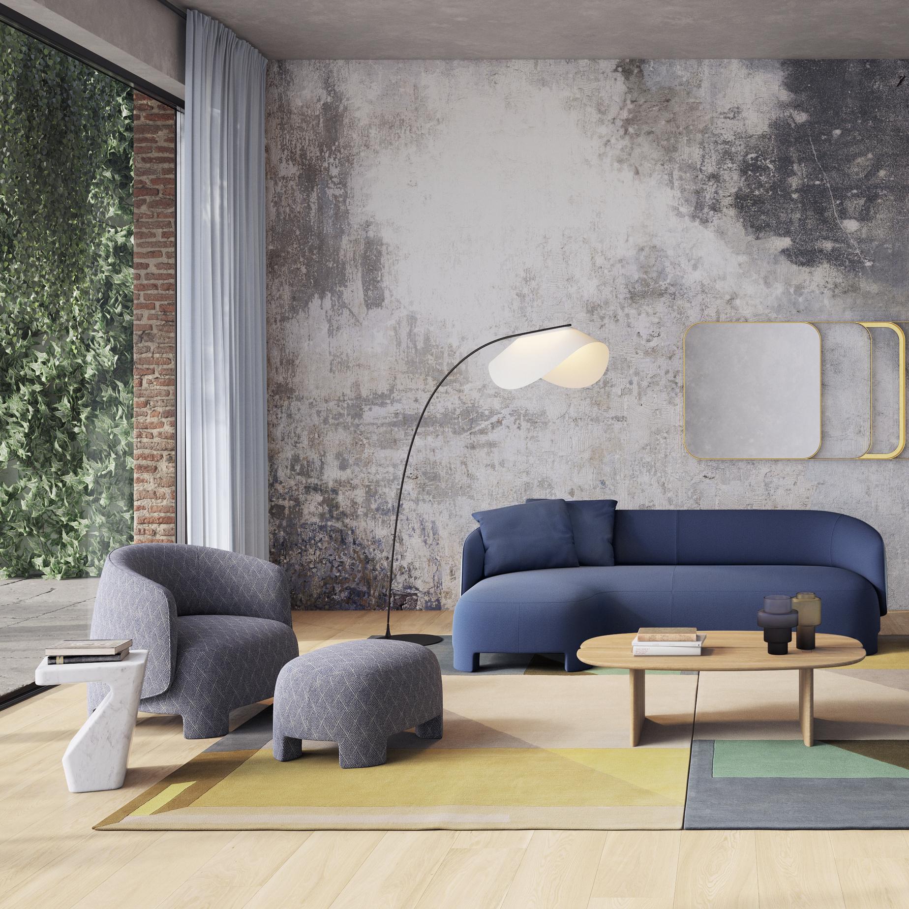 A woollen tufted rug, generously-sized in order to best capture the impression of perspective on which it is based : a play of light and shadows over a building with coloured walls and no ceiling. Slivers of sunlight, which are also seen on the right-hand side of the ”tableau” are also admitted by the top door bottom left.