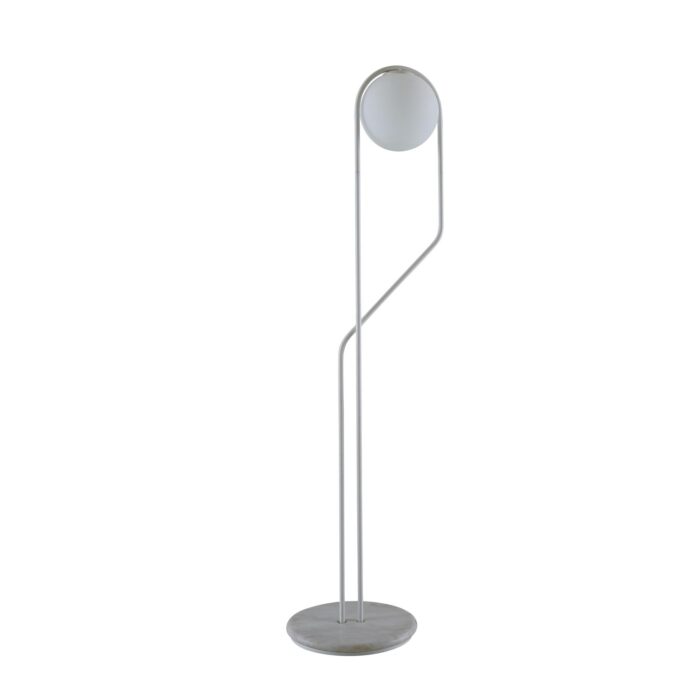 Floor lamp with plain ball-shaped glass shade. Base in Carrara marble Ø 40 cm thickness = 25 mm ; stem in 16 mm bent steel tubing, finished in Epoxy satin white lacquer RAL 9016. Round shade Ø 12cm in mouth-blown opal glass houses the LED bulb. Transparent PVC cable ; transparent foot-operated switch. 13 W E 27 LED bulb 1,140 lumens, colour temperature 3,000 K (warm white).