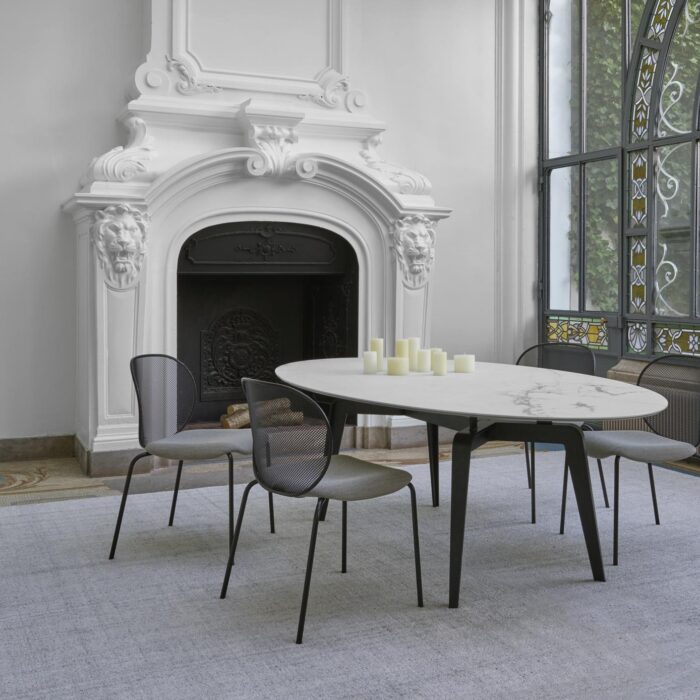 Resolutely feminine in inspiration, the design of the Unbeaumatin chair offers supple, polished forms in which the material is dealt with lightly. The seat rests on its support gently, undulating like a soft fabric which falls across the legs of a woman. The back envelops the user in a shaped mesh which brings visual lightness by creating zones of transparency. For use in a garden or in a living room.