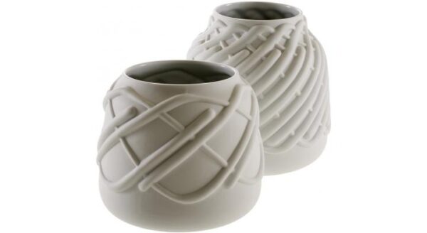 Vase in matt white moulded porcelain, with biscuit porcelain on the exterior and clear enamel on the interior.